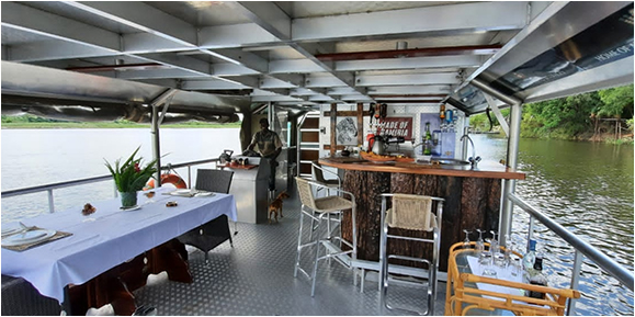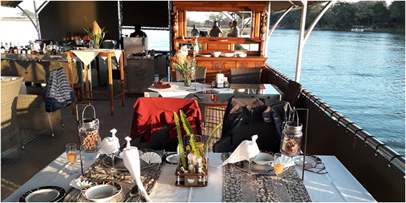 Unsere Abendessenfahrt startet um 18h00 mit einem Glass Sekt. Es werden Ihnen einige leichte Snacks angeboten. Nach einer kurzen Flussfahrt verlassen Sie das Boot und geniessen den traumhaften Sonnenuntergang mit Lagerfeuer auf der Insel! Der afrikansche Abend, mit Sternenpanorama, beginnt mit einem 5 gaengingen Abendessen welches unser Chef fuer Sie auf dem Boot zubereitet hat. Zu diesem Leckerbissen werden Ihnen verschiedene Cocktails, Alkoholische und Nicht – Alkoholische Getraenke angeboten. Natuerlich gibt es auch Bier vom Fass!Der Dinner Cruise endet um 21h30.